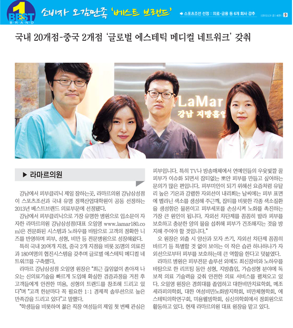 강남에서 피부클리닉 제일 잘하는곳, 라마르의원강남삼성점이 스포츠조선과 국내유명정책산업대학원이 공동 선정하는 2013년 베스트브랜드 의료부문에 선정되었다.