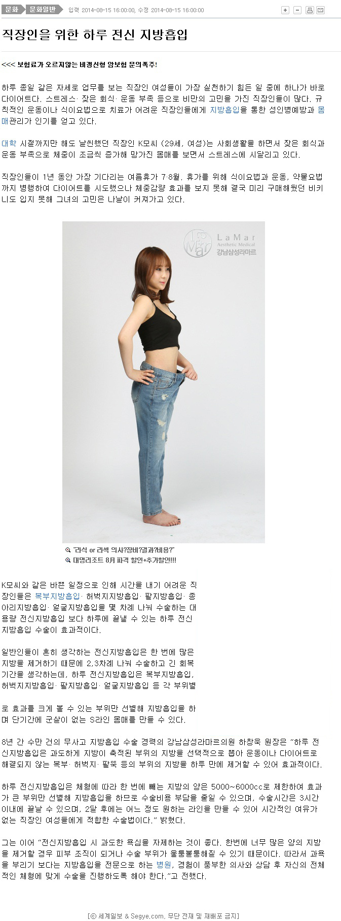 강남삼성라마르 언론보도, [세계일보] 직장인을 위한 하루전신지방흡입
