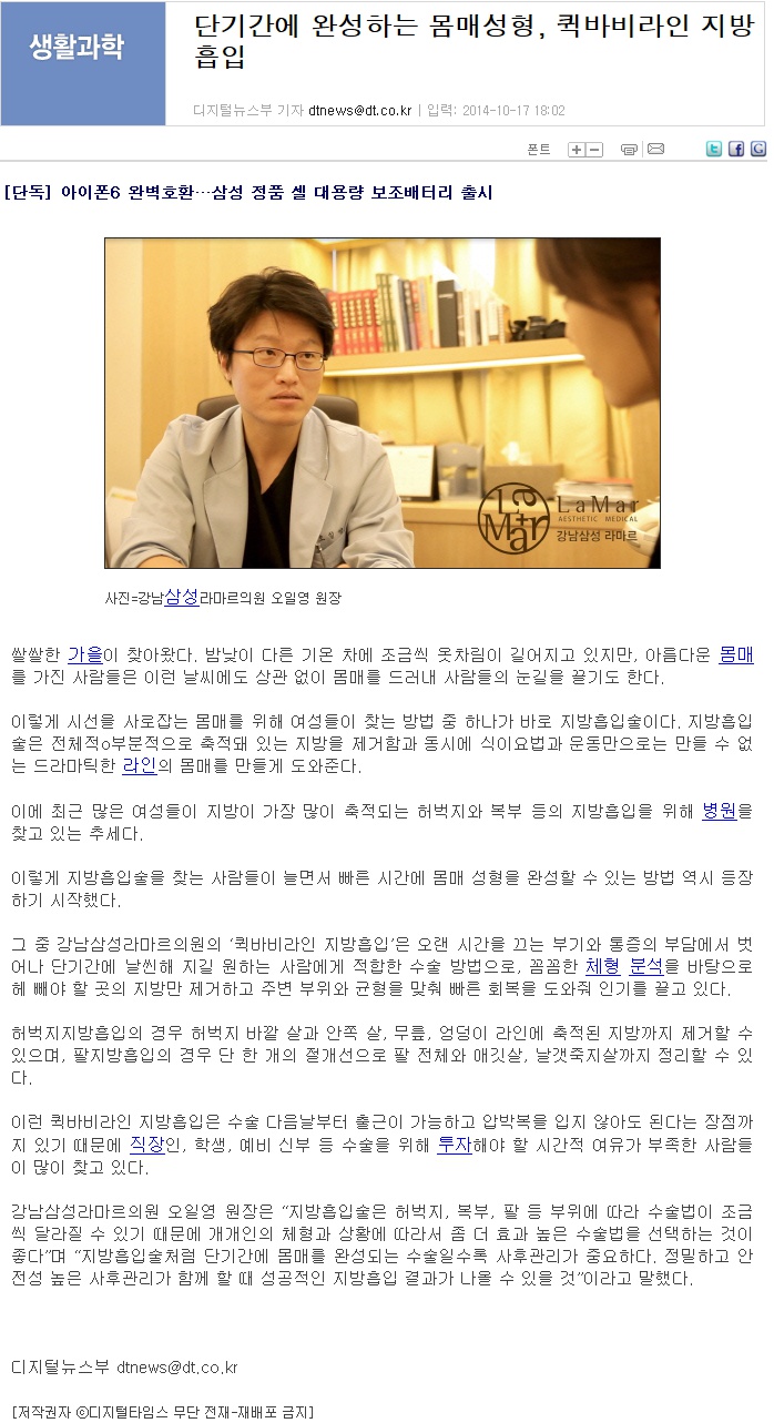 [디지털타임스] 단기간에 완성하는 몸매성형, 퀵바비라인 지방흡입자세히보기 : http://www.dt.co.kr/contents.html?article_no=2014101702109919807088
