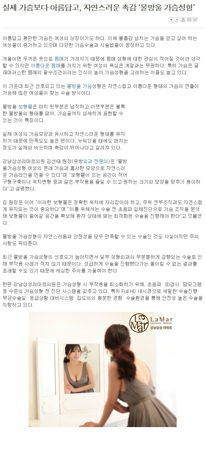 [스포츠월드] 실제 가슴보다 아름답고, 자연스러운 촉감 ‘물방울 가슴성형’