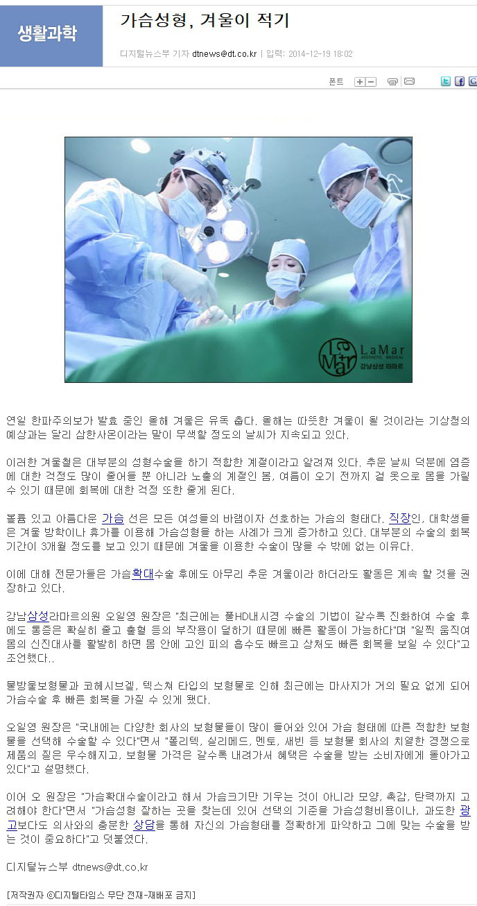 [디지털타임스] 가슴성형, 겨울이 적기