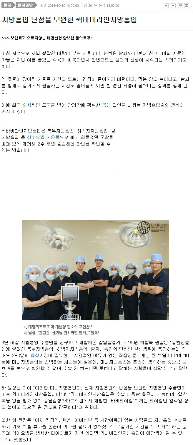 [세계일보] 지방흡입 단점을 보완한 퀵바비라인지방흡입