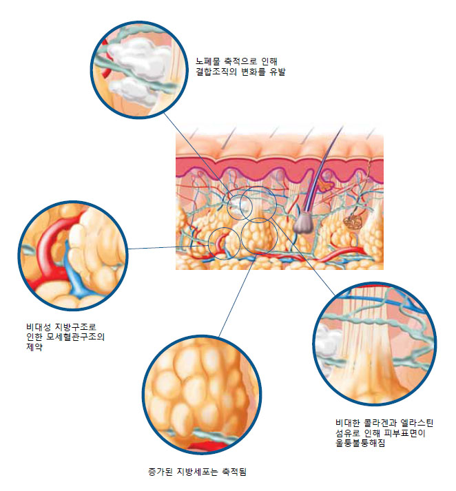-뭉친 피하 지방세포는 셀룰라이트의 주요 원인이다.