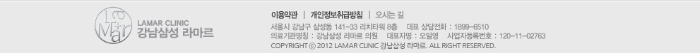 라마르 강남삼성점 서비스 이용약관 제 1장 총칙 제1조(목적) 이 약관은 라마르 강남삼성점이 제공하는 모든 서비스의 이용조건 및 절차에 관한 사항과 기타 필요한 사항을 전기통신사업법 및 동법 시행령이 정하는 대로 준수하고 규정함을 목적으로 한다. 제2조(회원의 정의) (1) “이용자”란 서비스에 접속하여 본 약관에 따라 의원이 제공하는 서비스를 받는 회원 및 비회원을 말한다. (2) “회원”이란 의원의 회원으로 적합하다고 인정하는 일반 개인으로 본 약관에 동의하고 비밀번호 등의 개인정보를 제공하여 회원등록을 한 자로서 의원의 정보를 지속적으로 제공받으며, 의원이 제공하는 서비스를 계속적으로 이용할 수 있는 자를 말한다. 제3조(약관의 효력과 변경) (1) 이 약관은 그 내용을 의원의 웹사이트에 게시하거나 기타의 방법으로 회원에게 공지함으로 효력이 발생한다. (2) 의원은 사정상 필요한 경우와 영업상 중요한 사유가 발생할 경우 약관을 변경할 수 있으며, 변경된 약관은 전항과 같은 방법으로 효력이 발생한다. (3) 회원은 변경된 약관의 동의하지 않을 경우 회원탈퇴를 요청할 수 있다. 변경된 약관의 효력발생일 이후에도 서비스를 계속 이용할 경우 약관의 변경사항에 동의한 것으로 간주된다. 제4조(약관외 준칙) 이 약관에 명시되지 아니한 사항에 대해서는 전기통신기본법, 전기통신사업법, 정보통신망 이용촉진 등에 관한 법률 및 기타 관련 법령의 규정에 따른다. 제 2장 서비스 이용계약 제1조(이용계약의 성립) (1) 이용계약은 이용자의 이용 신청에 대한 의원의 이용 승낙과 이용자의 약관 내용에 대한 동의로 성립된다. (2) 회원으로 가입하여 서비스를 이용하기를 희망하는 자는 의원이 요청하는 소정의 신규 회원가입 양식에서 요구하는 사항을 기록하여 신청한다. (3) 온라인 가입신청 양식에 기재하는 모든 회원 정보는 실제 데이터인 것으로 간주한다. 실명이나 실제 정보를 입력하지 않은 사용자는 법적인 보호를 받을 수 없으며, 서비스 사용의 제한을 받을 수 있다. (4) 의원은 다음 각 호에 해당하는 경우 이용 신청에 대하여 승낙하지 아니한다. 가. 본인의 실명으로 신청하지 않은 경우 나. 다른 사람의 명의를 빌리거나 도용하여 차명으로 신청한 경우 다. 회원가입신청서의 내용을 허위로 기재하였거나 첨부한 경우 라. 관계법령에 위배되거나 사회의 안녕질서 혹은 미풍양속을 저해할 수 있는 목적으로 신청한 경우 마. 기타 의원이 정한 이용신청 요건이 미비 된 경우 제2조(회원탈퇴 및 자격상실) (1) 회원이 의원이 제공하는 서비스의 탈퇴를 원하면 회원 본인이 온라인상에서 직접 탈퇴 요청을 해야 한다. (2) 탈퇴 신청 시 본인임을 알 수 있는 ID, 비밀번호, 주민등록번호, 해지사유를 입력하면 가입기록과 일치 여부를 확인한 후 가입을 해지한다. (3) 탈퇴 여부는 기존의 ID와 비밀번호로 로그인이 되지 않으면 해지된 것이다. (4) 의원은 회원이 다음 사항에 해당되는 행위를 하였을 경우, 사전 통지 없이 이용계약을 해지하거나 기간을 정하여 서비스 이용을 중지할 수 있다. 가. 공공 질서 및 미풍 양속에 반하는 경우 나. 범죄적 행위에 관련되는 경우 다. 국익 또는 사회적 공익을 저해할 목적으로 서비스 이용을 계획 또는 실행할 경우 라. 타인의 ID 및 비밀번호를 도용한 경우 마. 타인의 명예를 손상시키거나 불이익을 주는 경우 바. 같은 사용자가 다른 ID로 이중 등록을 한 경우 사. 기타 관련 법령이나 의원이 정한 이용조건에 위배되는 경우 제3조(회원 재가입) (1) 제2조에 의하여 서비스에서 탈퇴한 사용자가 재가입을 원할 경우 회원 본인이 직접 전자메일을 통해 재가입을 신청하면, 웹마스터의 승인에 의해 재가입 여부가 결정된다. 제 3장 서비스 제공 및 이용 제1조(서비스 이용시간) (1) 서비스의 이용시간은 의원의 업무상 또는 기술상 특별한 지장이 없는 한 연중무휴 1일 24시간을 원칙으로 한다. 다만 정기 점검 등의 필요로 의원이 정한 날이나 시간은 그러하지 아니한다. 제2조(서비스 내용) (1) 치아 컨텐츠 제공 (2) 의원 온라인 예약 서비스 (3) 의료상담 서비스 제3조(서비스 중단) (1) 의원은 다음 각 호에 해당하는 경우 서비스의 전부 또는 일부의 제공을 제한하거나 중지할 수 있다. 가. 서비스용 설비의 보수점검, 교체 및 장애 등으로 인한 부득이한 경우 나. 전기통신사업법에 규정된 기간통신사업자가 전기통신 서비스를 중지했을 경우 다. 국가비상사태, 정전 등의 사유가 발생한 경우 라. 서비스 이용의 폭주 등으로 정상적인 서비스 이용에 지장이 있을 경우 (2) 제 (1)에 의한 서비스 중단의 경우에는 이용자에게 사전 또는 사후 공지하도록 한다. (3) 제 (1)의 사유로 서비스 제공이 일시적으로 중단됨으로 인하여 이용자 또는 제3자가 입은 손해에 대하여 배상하지 아니한다. 제4조(게시물의 저작권) 서비스에 게재된 자료에 대한 권리는 다음 각 호와 같다. (1) 회원은 서비스를 이용하여 얻은 정보를 가공, 판매하는 행위 등 서비스에 게재된 자료를 상업적으로 사용할 수 없다. (2) 게시물에 대한 권리와 책임은 게시자에게 있으며 의원은 게시자의 동의 없이 이
